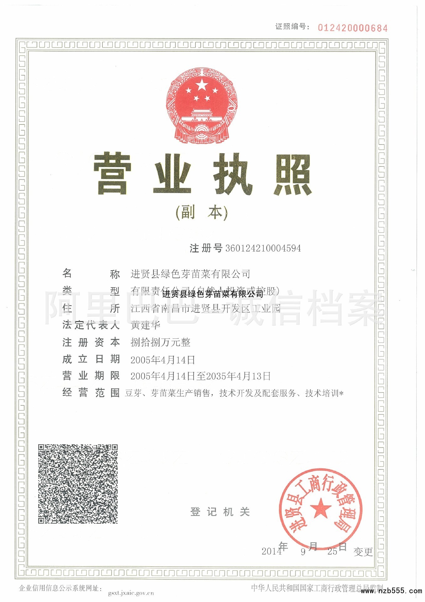 | 發(fā)證機(jī)構(gòu): | 進(jìn)賢縣工商行政管理局 | 發(fā)證時間 : | 2014-09-25 |