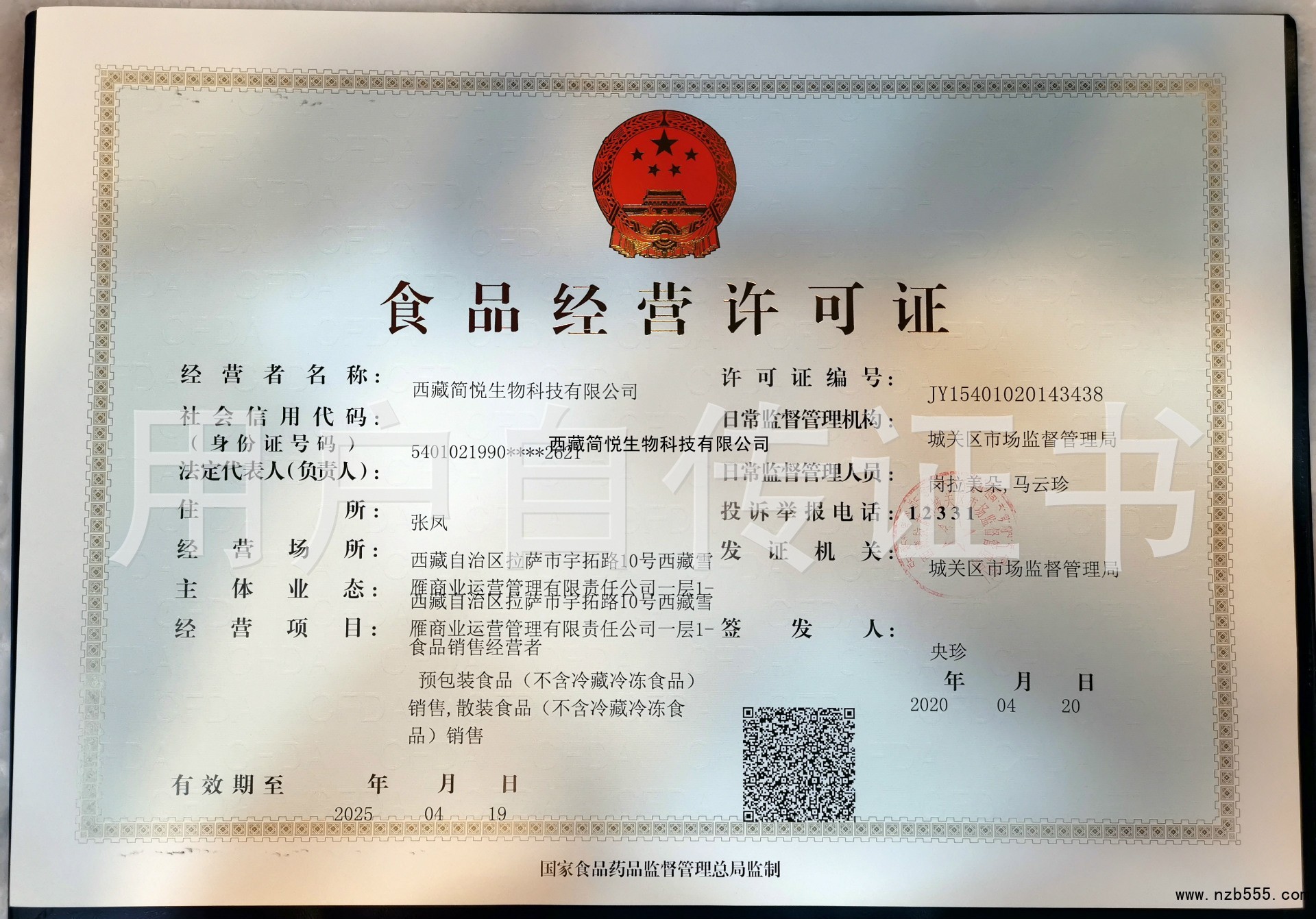 | 發(fā)證機(jī)構(gòu): | 西藏拉薩市城關(guān)區(qū)市場監(jiān)督管理局 | 發(fā)證時(shí)間 : | 2020-04-20 |